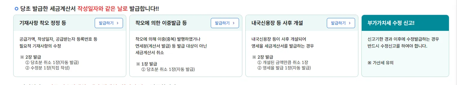 본 안내는 세금계산서 오발행 시, 수정 (세금)계산서 발행 방법을 안내하는 페이지입니다.