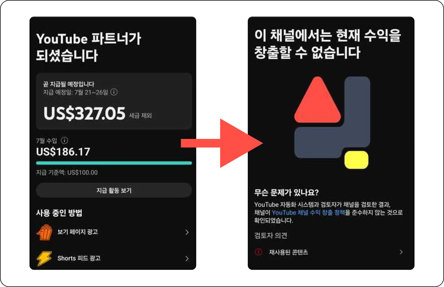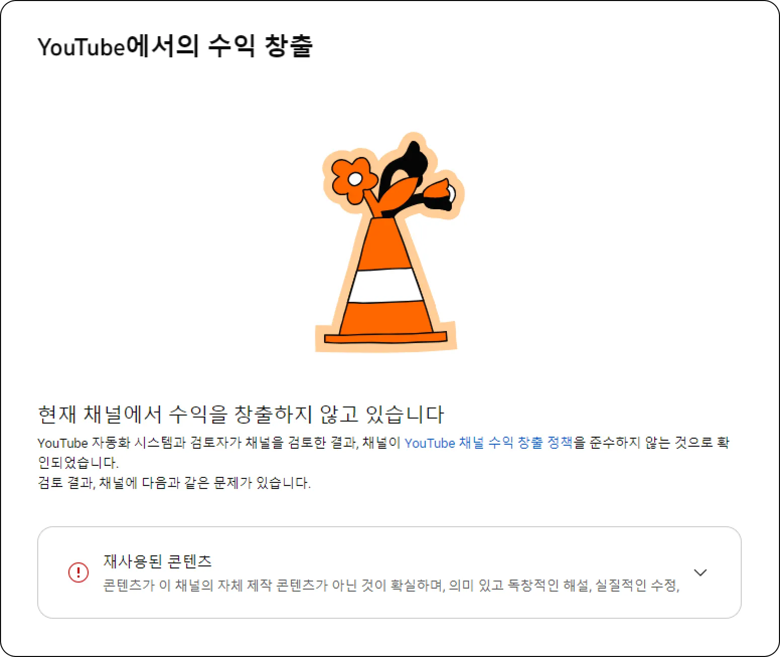 다음 화면은 재사용된 콘텐츠로 수익 창출 정지 처분을 받으면 확인할 수 있는 화면입니다.