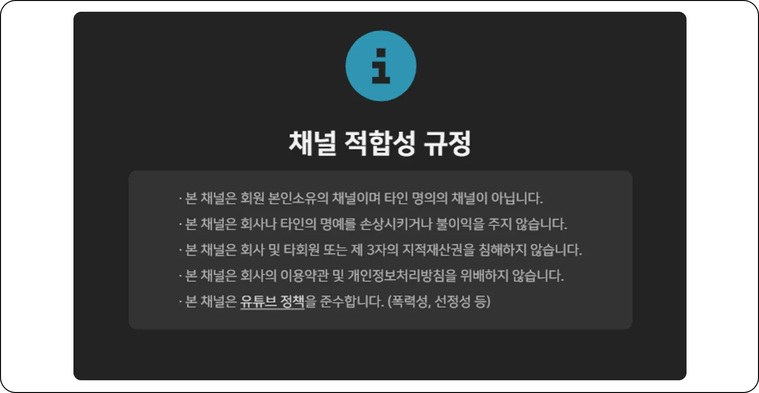 채널 등록 과정에서 채널 적합성 규정에 대한 동의를 받는 이유 또한 이와 같습니다.