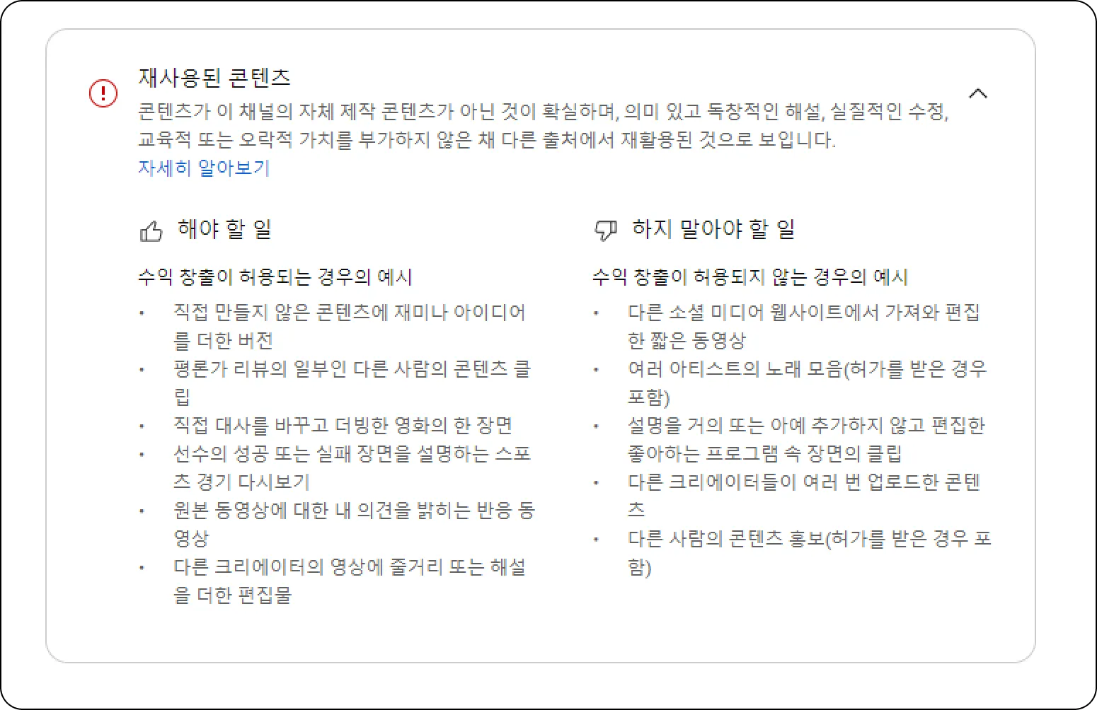 버튼을 눌러 열어보면, 불펌 컨텐츠를 제작했었다면 보통 본인의 영상이 “하지 말아야 할 일”에 해당되는 경우에 포함되는 경우가 많습니다.