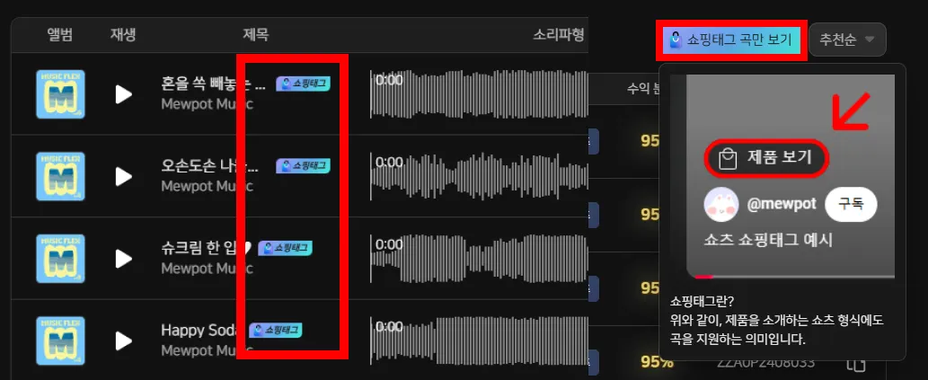 이제 뮤직플렉스 음원으로도 YouTube Shopping 쇼츠 영상을 제작할 수 있게 되었으며, 이 YouTube Shopping에 삽입 가능한 음원은 음원 찾기 페이지에서 확인이 가능하도록 음원 제목에 태그를 부착하였습니다!