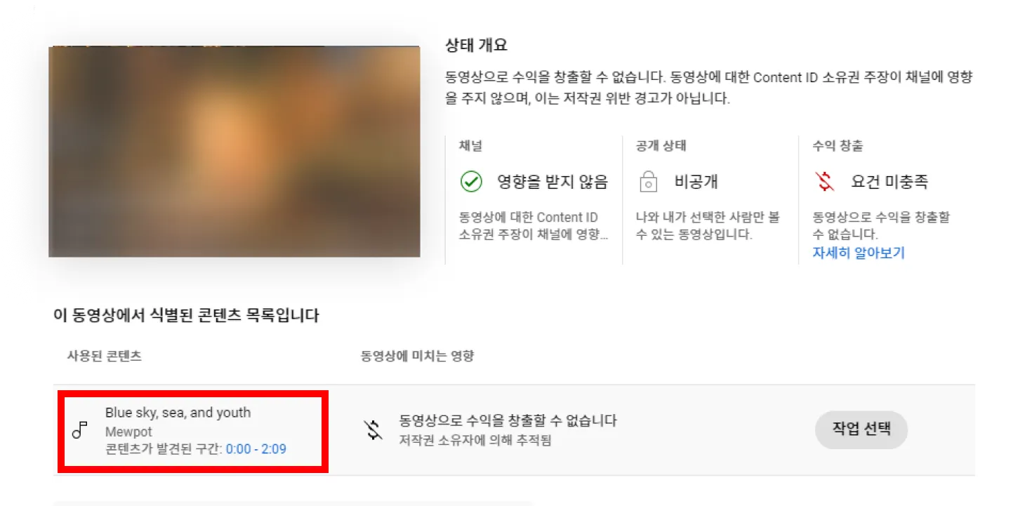 1. 해당 영상의 저작권 제한사항에서 작업 선택을 클릭합니다.