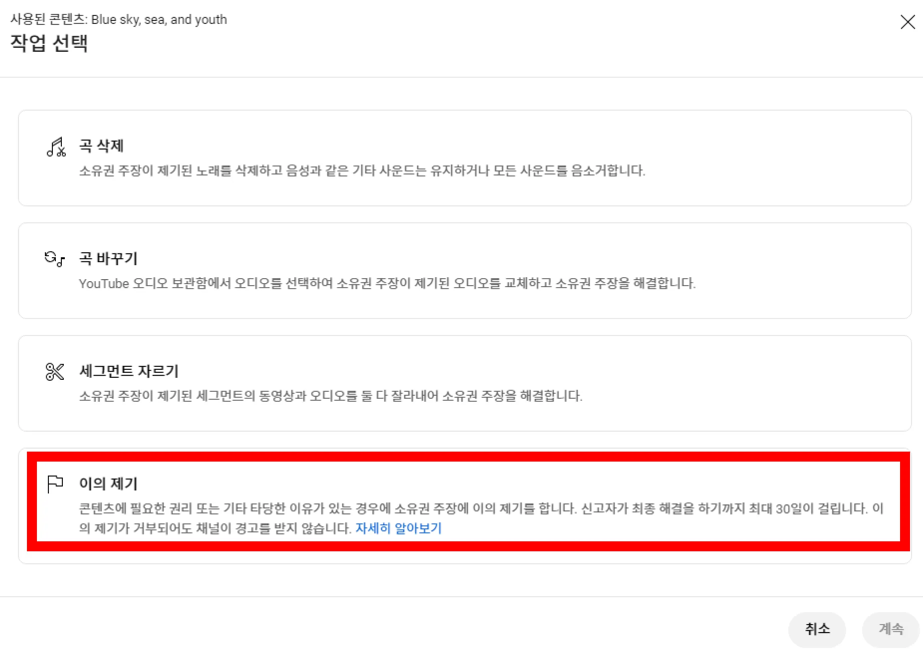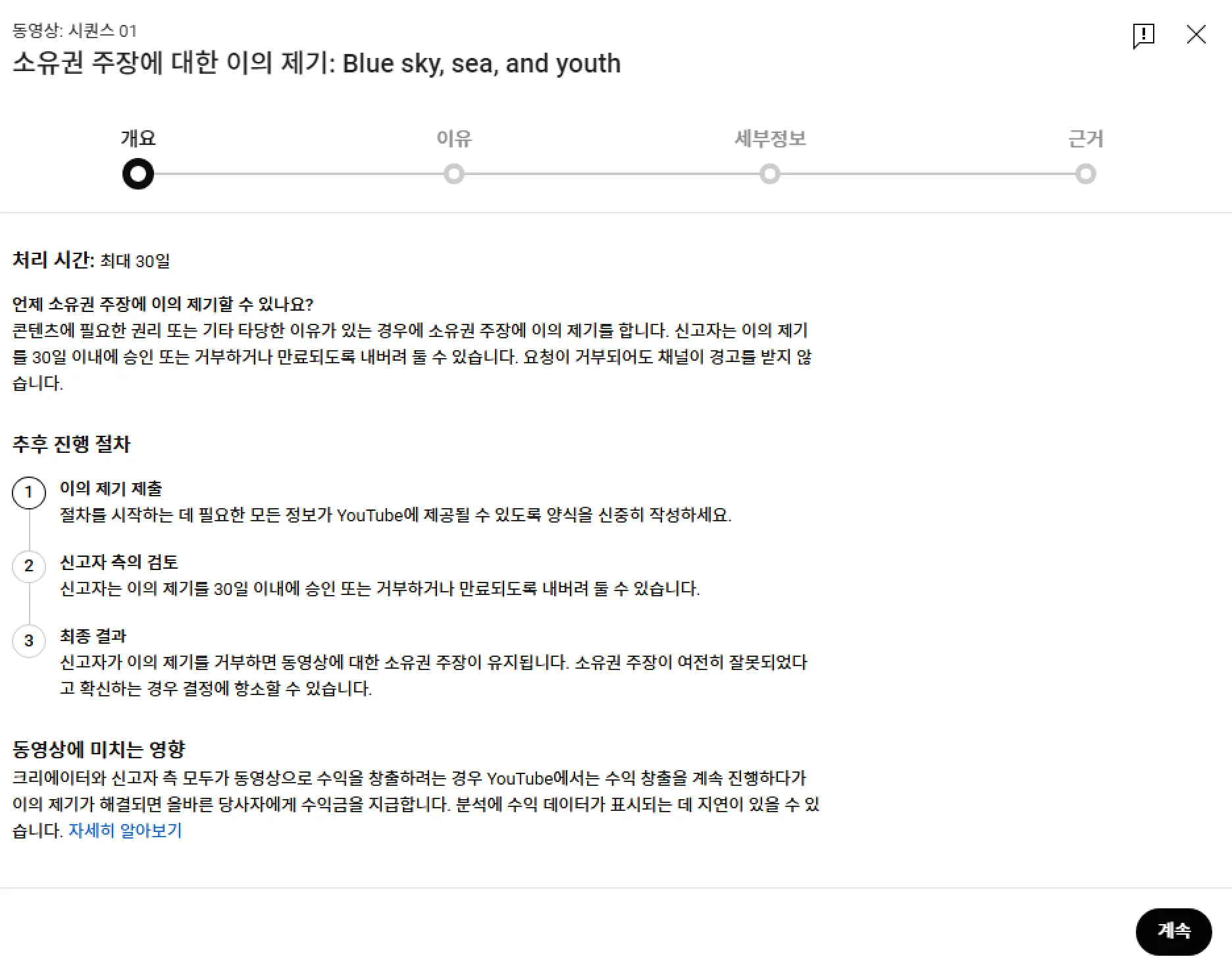 2. 이이서 이의제기를 선택 후 계속을 클릭합니다.