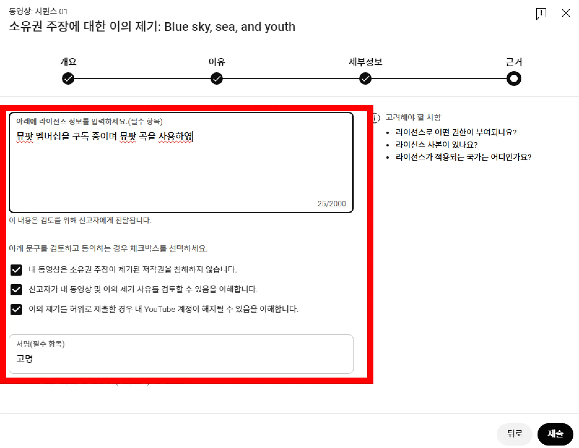 3. 소유권 주장에 대한 이의제기를 아래 사진과 같이 진행 후 제출을 누르시면 완료입니다.