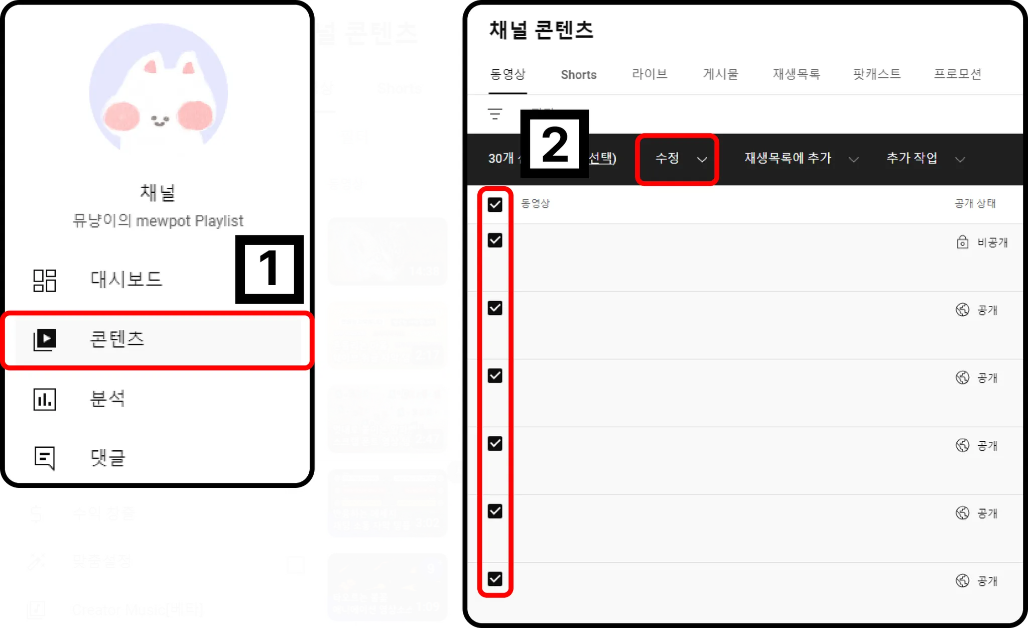 이후, “콘텐츠” 메뉴에서, 설정을 변경할 영상을 선택하고 “수정” 버튼을 누릅니다.
