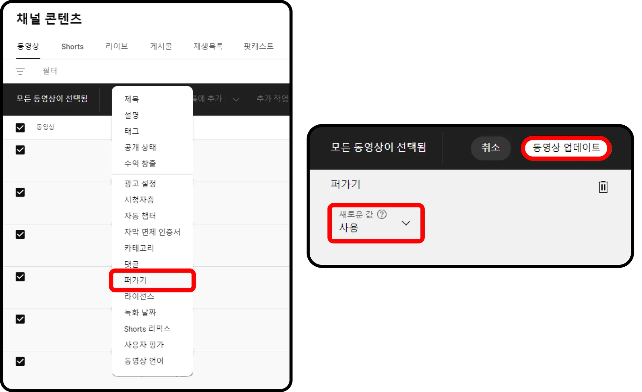 여러 개의 영상을 한번에 변경할 수 있으며, “모두 선택” 버튼을 누르면 채널에 업로드된 모든 영상의 설정을 변경할 수 있습니다.