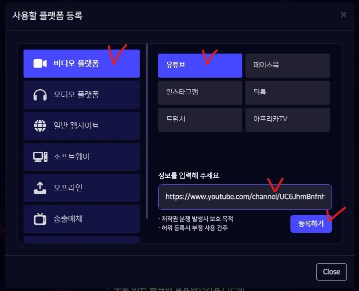 비다오 플랫폼 > 유튜브 > 채널 URL주소 기입 > 등록하기 순으로 클릭합니다.