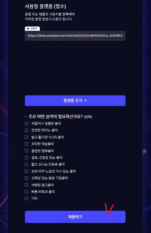 ▲ 등록된 플랫폼을 확인한 후 제출하기 클릭하면 완료됩니다.
