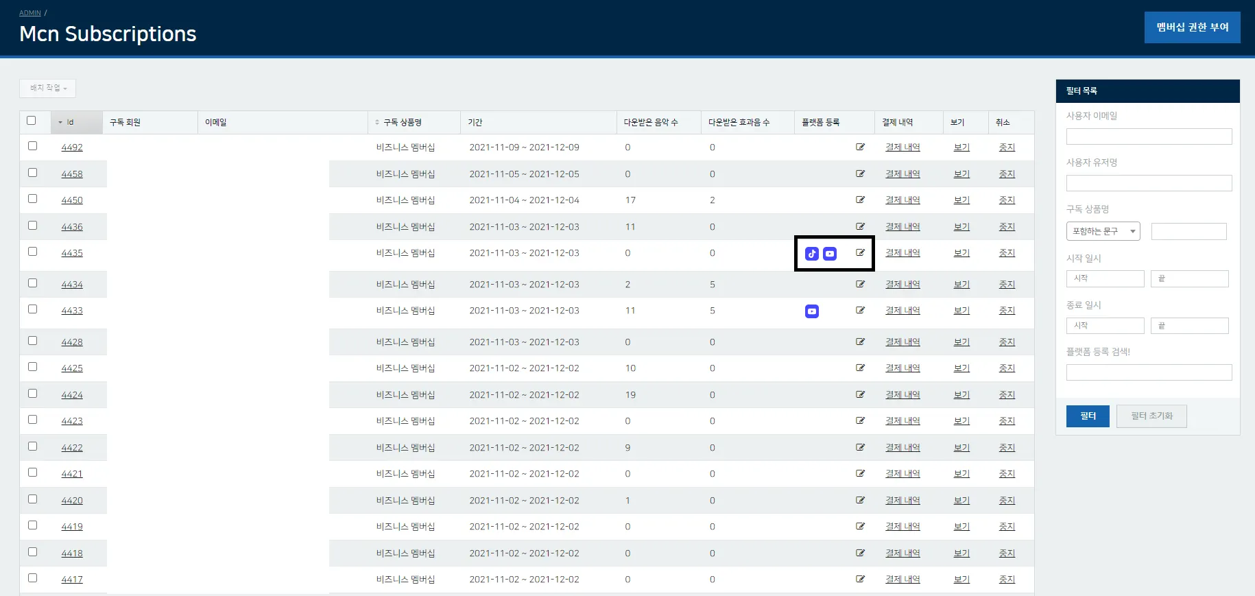 MCN 활성 멤버십 관리 메뉴 페이지에 접속하시면 다음과 같이 플랫폼 등록 상태를 보실 수 있습니다.