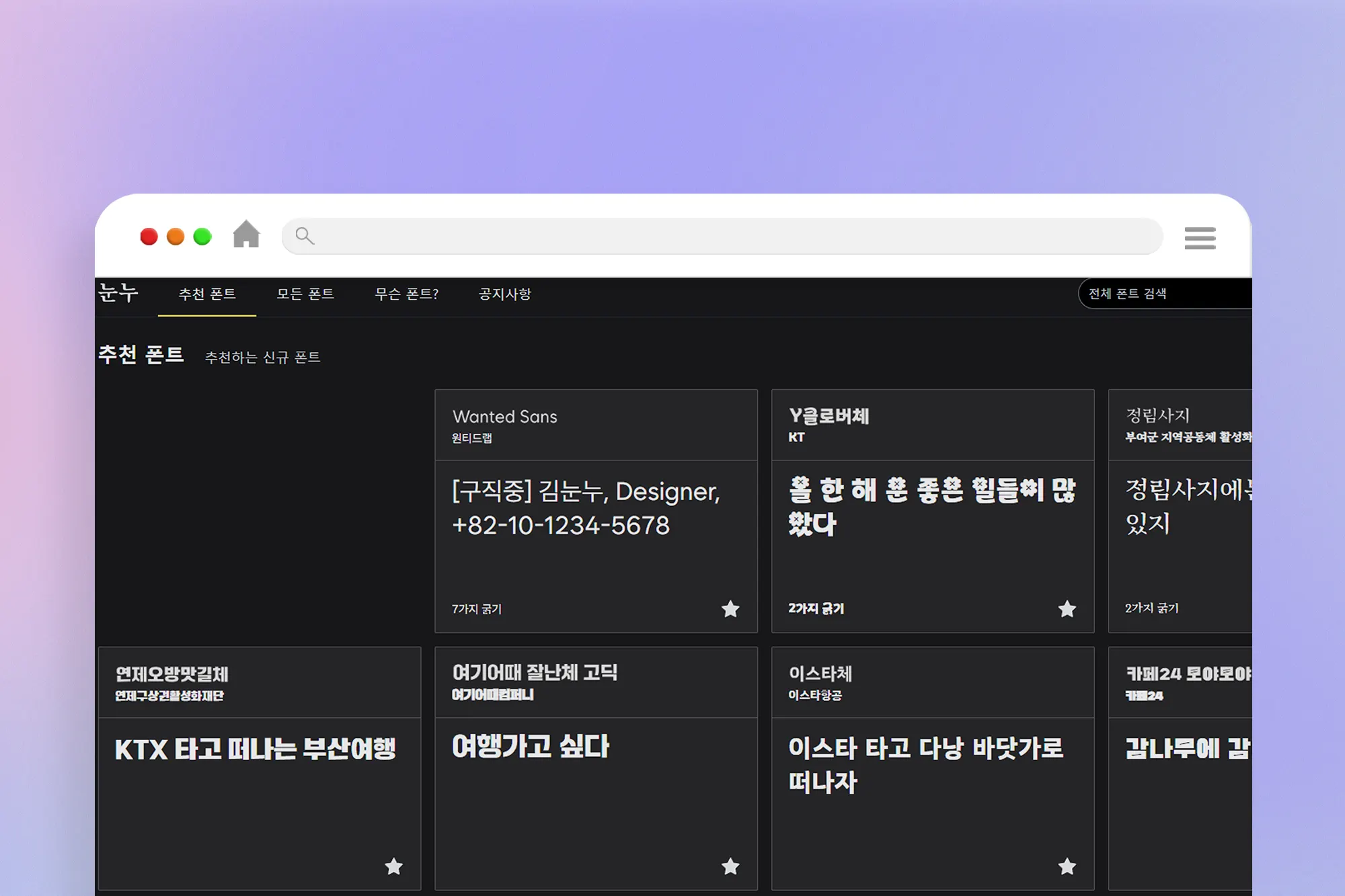 ‘눈누(Nunuu)’는 상업적으로 이용 가능한 무료 한글 폰트를 한곳에서 쉽게 찾아볼 수 있는 대표적인 폰트 사이트입니다.