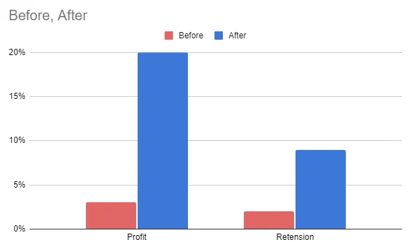 Approximate percentage of business profit and retention rate increase difference between before and after use of Mewpot.