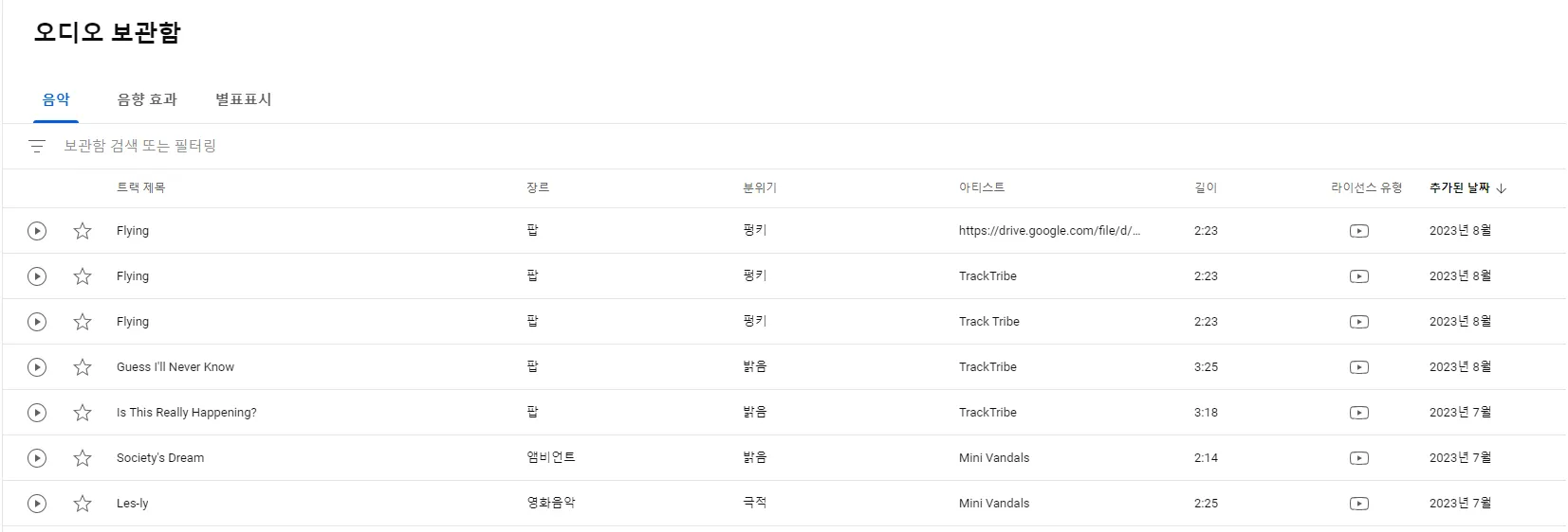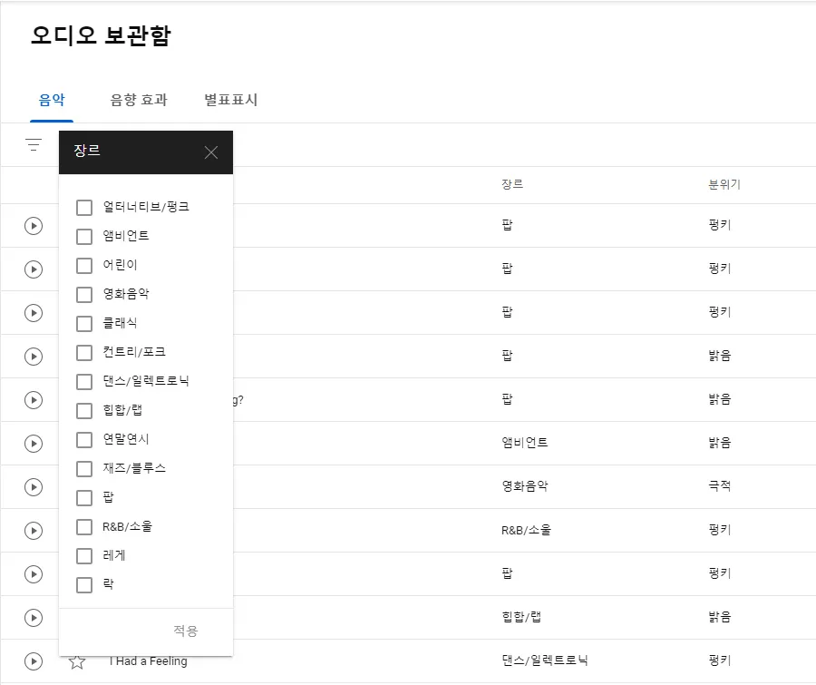 유튜브 오디오 보관함도 물론 필터링 기능으로 장르등으로 기본적으로 카테고리가 나눠져 있기는 한데, 막상 들어보면 제가 머릿속에서 그리던 그 느낌이 안나서 여러 음원을 좀 많이 들어봤어야 했는데,