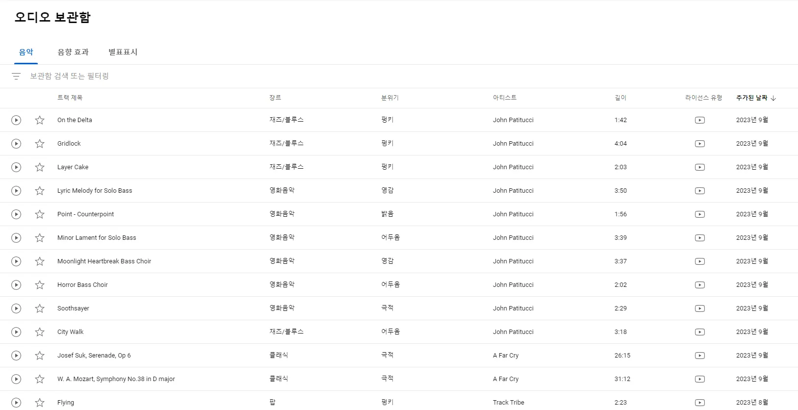 무료 음원은 유튜브 라이브러리를 사용했고, 그 외에는 스토리블락을 사용하거나 개별구매하여 사용했습니다.
