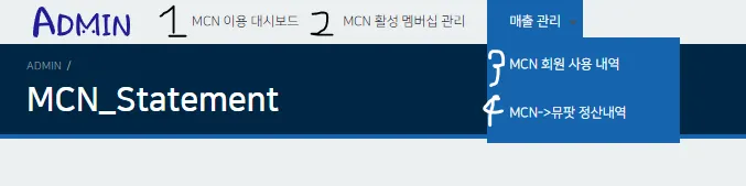 매출 관리 ⇒ MCN 회원 사용 내역 : 이미 사용기간이 끝난 결제 내역과 현재 사용중인 내역을 모두 볼 수 있는 페이지 입니다. 이곳에서 이용자들의 음악이나 효과음 다운로드 횟수를 확인하실 수 있습니다.