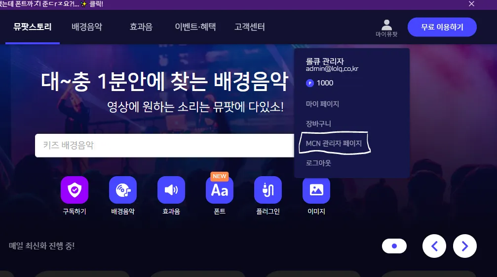 뮤팟 MCN 관리자 페이지 사용을 위해서는 MCN 관리자 계정으로 로그인 ⇒ 마이뮤팟 ⇒ MCN 관리자 페이지 로 접속해주시면 됩니다.