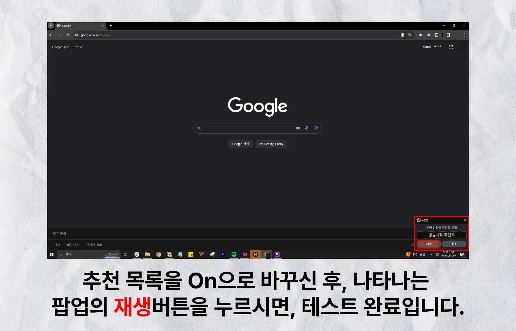 모든 준비를 마치면, 트위치 스튜디오등 방송을 시작후 약 30초이내에 우측 하단부에서 팝업이 올라옵니다. 여기서 재생 버튼을 누르고 1분 후 종료해주시면 테스트 종료입니다.