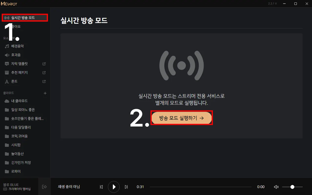 왼쪽 상단의 메뉴에서 “실시간 방송모드” 클릭 후 “방송 모드 실행하기→”를 클릭해주세요.