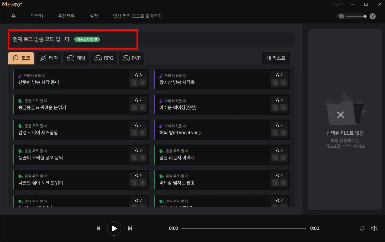 추천모드를 켜고 난 후 방송모드가 자동 감지됨이라면 준비 완료입니다.